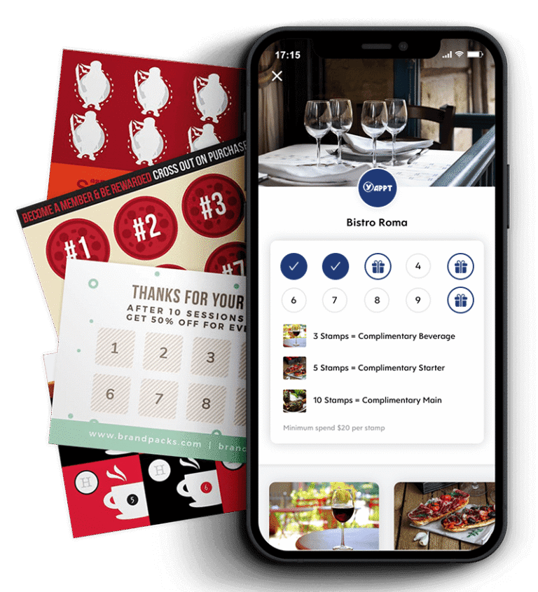 Branded loyalty card with configurations of 1 to 20 loyalty voucher. Cards are issued per visit, or on minimum spend. You decide. Works for any industry